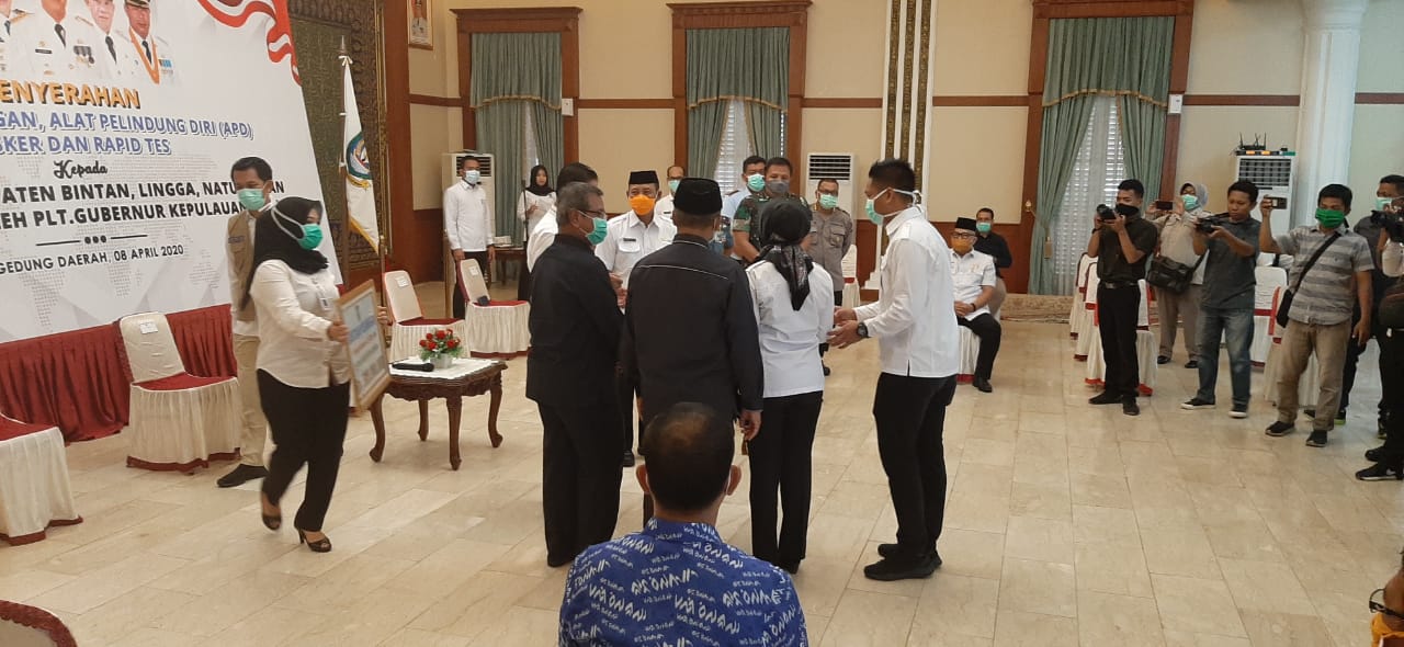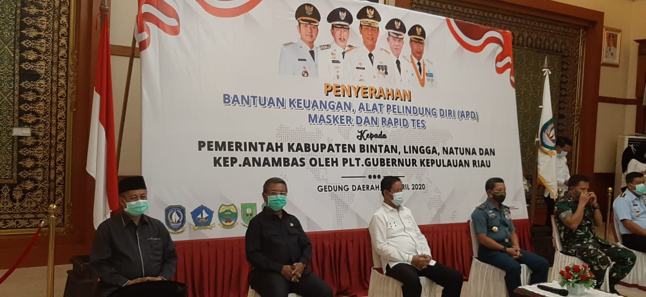 Penyerahan Bantuan Keuangan, Alat Pelindung Diri (APD), Masker dan Rapid Tes kepada Pemerintah Kabupaten Bintan, Lingga, Natuna dan Kepulauan Anambas oleh Plt. Gubernur Kepri didampingi FKPD